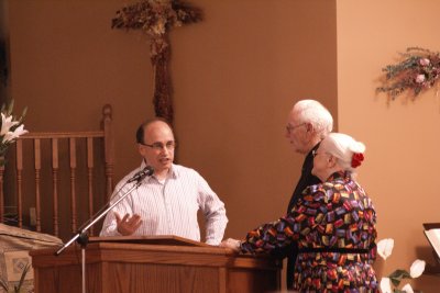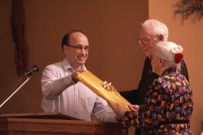 On Saturday, a group of around eighty gathered in the main auditorium to pay special tribute to the many years of faithful service by Chester and Marion in the ministry of Harmony House. Friends came from Kirkland Lake, Iroquois Falls, Timmins and area, and of course South Porcupine to pay special honour to this couple. Organized and emceed by Jim M. the evening began with prayer and continued with a number giving speeches. Mr. & Mrs. D. shared the history and philosophy of this ministry, while Yves took this occasion to them a present a special plaque. A short video slide show chronicled their Harmony House years, while Andy brought video greetings. Anna and Becky also gave particular thanks to the “D’s”. There was an open-mike time, when there were speeches, thanks, and not a few tears as we remembered with gratitude the impact on our lives of these dear friends. It was very apparent that this couple has been used greatly for the Lord, and it was so nice to be able to share in the praises offered. We all retreated to the fellowship hall for snacks and a wonderful time of Christian sharing following.