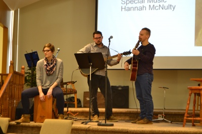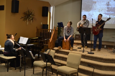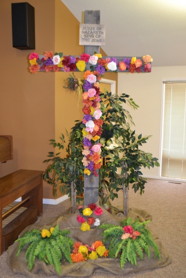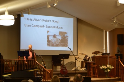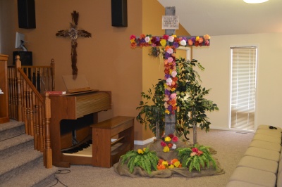 On April 1st (Easter Sunday) this year, over twenty five came out to the annual 8:00 am Easter Son-Rise Breakfast. It was a warm and happy time as we enjoyed a traditional breakfast including such favourites as baked beans, eggs, jowl bacon, ham, home fries and all those happy foods we associate with this time. Following breakfast, we joined with another ten additional to celebrate the Lord's supper...with joy and thanksgiving at the resurrection! This time flowed right into the next service (Celebrate Easter). As we entered the main sactuary, the cross which had been imbedded with nails from the Good Friday Service was now adorned with flowers growing from those same holes! This action symbolized the amazing effect of the resurrection on our lives. Around sixty or so. came out to enjoy this time with us, as the praise team again was a combination of several of our regular teams, with three favourite Easter Hymns (Christ Arose, Alleluia, Alleluia, and Crown Him with Many Crowns) and three contemporary hymns (He's Alive-Stan C, Once Again, and "O- Praise the Name"- Hannah M). Dr. David Hook gave the Easter Message on the topic of Jesus, God's Divine Son. The reality of the resurrection is the foundation of our faith, and it is the fact of the resurrection which gives each one a sure hope to face life's challenges.