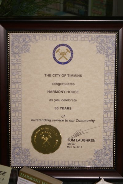 Saturday, May 12 marked a very special celebration in the life of Harmony House. Vickie gave a wonderful introductory concert of classic hymns on her keyboard as friends, family, customers, associates and those serving at this ministry gathered together to pay special tribute to Harmony House's 30th anniversary. Becky welcomed the Mayor of Timmins, Tom Laughren, who so graciously spoke at the occasion. On behalf of the city, the Mayor presented Becky (on behalf of Harmony House) a plaque of recognition for this achievement. Chester gave those present a wonderful history of the humble origins of the store, and his consistent policy of not 'taking a dime' from the store for his own needs. The Mayor echoed everyone’s thoughts when he said he was very moved by the dedication of Chester and Marion and made it very clear how much he respects and admires this kind of sacrifice. A special cake was cut by Mrs. Donaldson and Becky, and Dave gave a prayer of thanks and dedication. Stan finished the time with his down-home style of Christian country music while many took time to enjoy a coffee and a piece of cake. Meanwhile, inside the store, sales were humming, as customers took advantage of the 30% discounts in celebration of the thirty years of service.